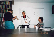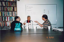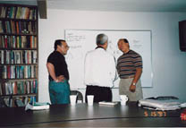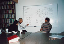 Discussing Eddie's theories of self-referential motion and the physics of tao with Kenneth Chung and Chen Qingzhou at the MRI.
